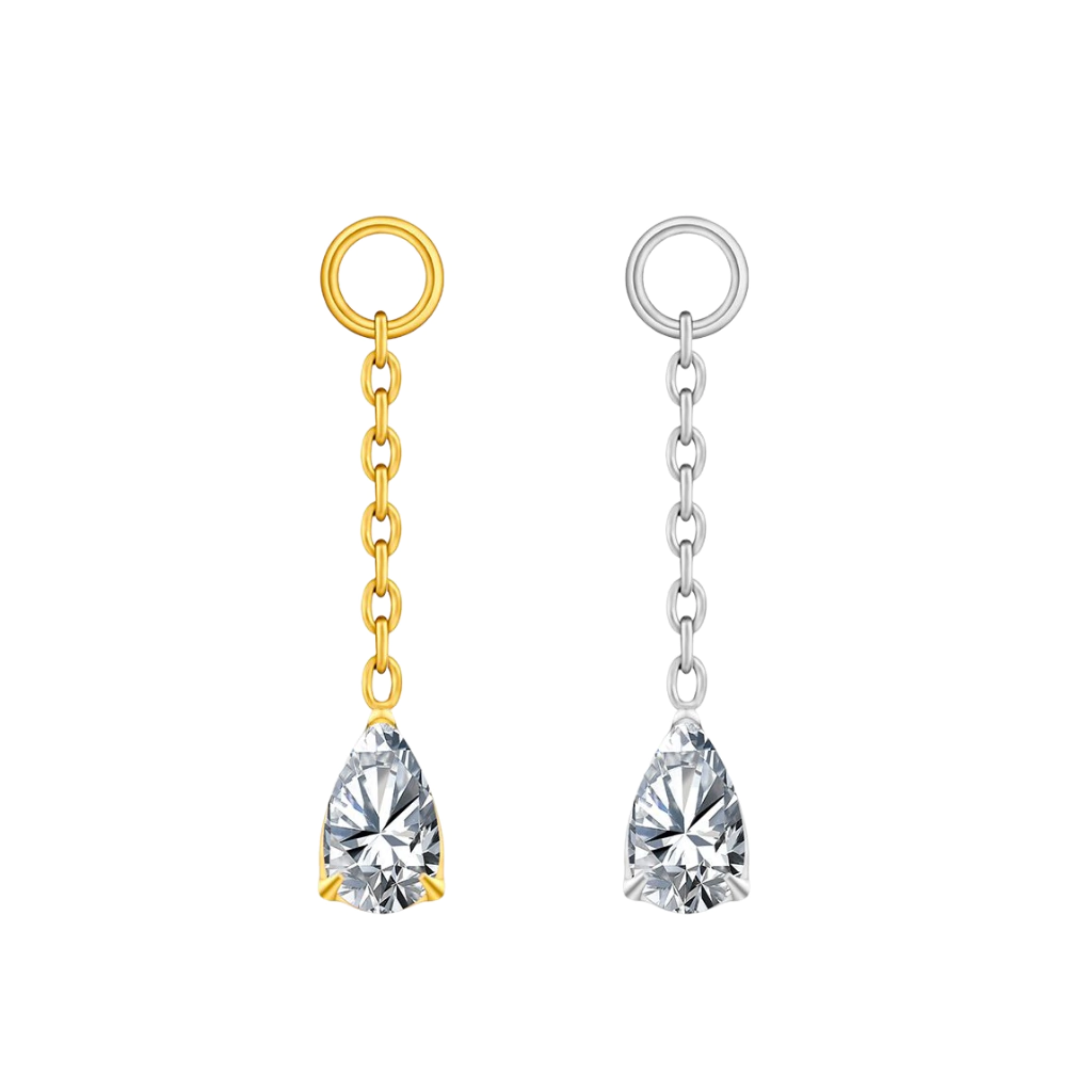 Seu design apresenta uma zircônia premium de 5 mm, lapidada em formato gota, que reflete a luz com intensidade suave e hipnotizante. A pedra parece capturar cada feixe luminoso, criando um brilho limpo e elegante que se adapta a diversos estilos e perfurações.